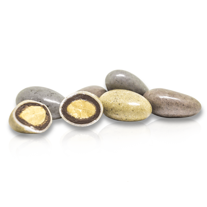 Ingrédients : chocolat noir (39,4 %) (pâte de cacao, sucre, beurre de cacao, émulsifiant : lécithine (SOJA)), sucre (33,3 %), AMANDE (27,3%), épaississant : gomme arabique, amidon de riz, arôme naturel de vanille avec autres arômes naturels, colorants : E150d, oxydes de fer [nano], charbon végétal, E133, agents d’enrobage : cire de carnauba, cire d’abeille.